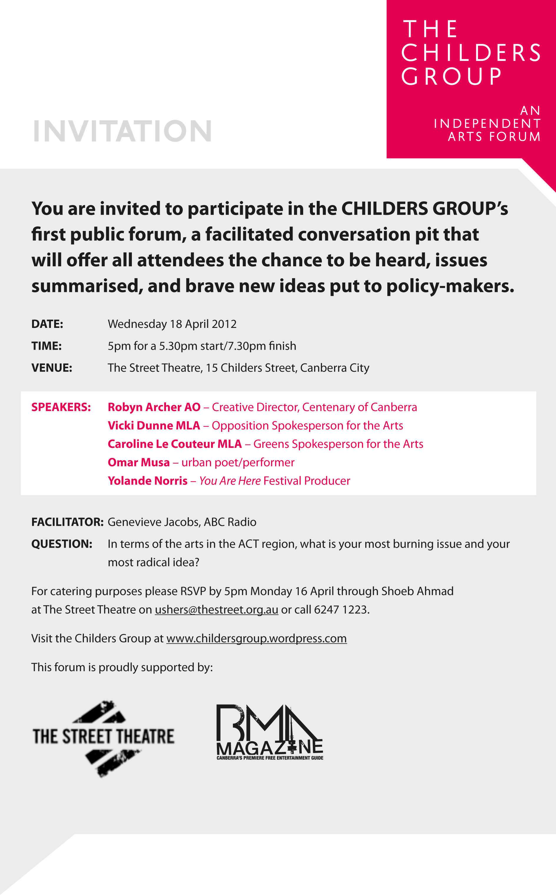 Comprising a group of ACT and region experienced arts leaders, the Childers Group is a new voice for the arts. It is an independent forum committed to the long-term viability and vitality of the arts in the ACT and surrounding areas. It involves recognised individuals from diverse backgrounds including the visual arts, music, dance, film, theatre and performing arts, youth arts, community arts and literature.