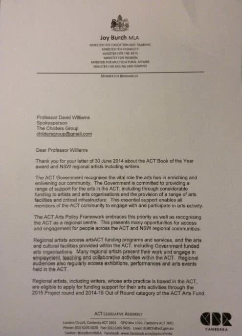 Finally, it is concerning to the Childers Group that the literary community appears to have not been consulted on this change of policy. We have been informed that the ACT Writers Centre, the ACT’s peak body for writing in the ACT region, was not consulted. A significant number of their members reside in the region.