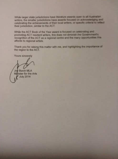 We respectfully ask that you review the recent announcement about the 2014 ACT Book of the Year, and ensure that there is consistency in eligibility requirements across ACT Government’s various arts programs and initiatives.